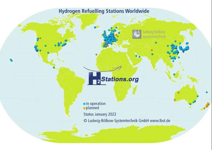 2022年2月,H2stations发布了其第14次全球加氢站统计报告,由于语言不通、信息不完全公开等原因,可以发现与其他网站公开的数据统计数据有一定偏差,但作为一个持续更新的数据源,通过其报告可以了解全球加氢站建设的基本情况和变化趋势,其数据依旧有较高的参考价值。