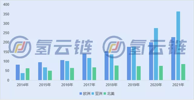 亚洲共有加氢站363座投运,集中在中日韩三国。其中日本159座,韩国95座。与大多数其他国家不同的是,中国105座加氢站是公共汽车或卡车的专用加氢站,而并非对公众开放。在新增方面,韩国2021年新增加氢站的数量为历年最多,有36个新的加氢站,并且正在不断扩大所有燃料电池电动汽车的基础设施。
